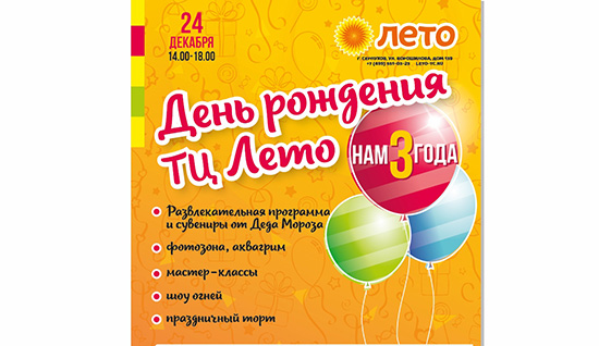 - веселый квест "Путешествие в Лето". Тот, кто пройдет, все испытания квеста, сможет принять участие в финальном розыгрыше призов от ТЦ Лето и спонсоров - магазина "ДНС-цифровой", "Лето Парка", ювелирного салона "Монарх", салона мебели "Диол", "ДоДо пиццы", "Кофе Вей". Главный приз - телевизор!
